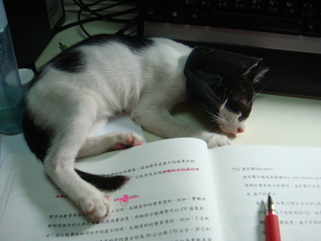 番茄小姐在念書的時候短短還回躺在電腦跟她的書中間